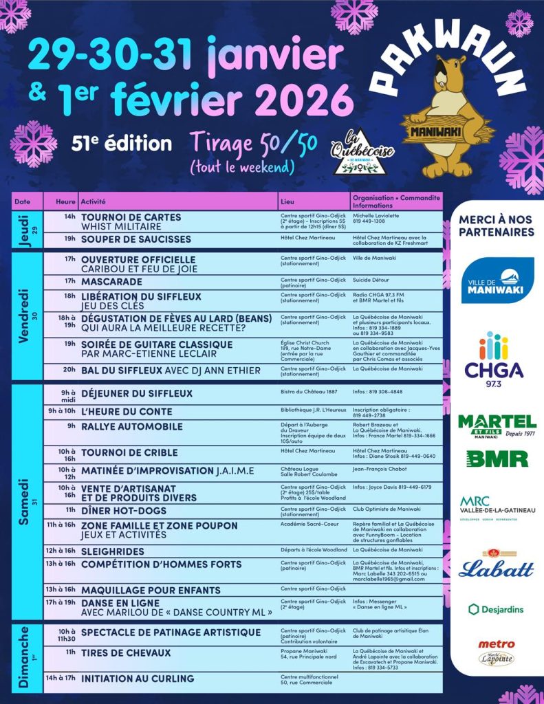 The Club La Québécoise of Maniwaki invites you to the 51st edition, taking place on January 29, 30, and 31 as well as February 1 in Maniwaki. Join us in large numbers and take part in the many activities offered throughout the weekend!