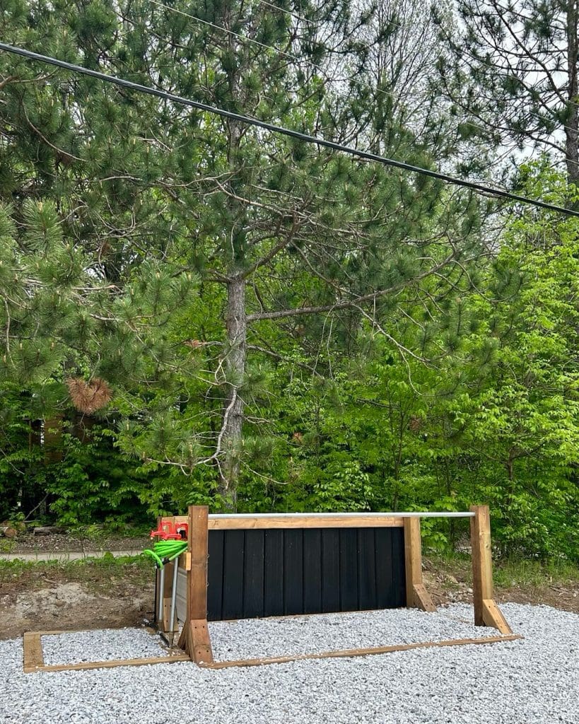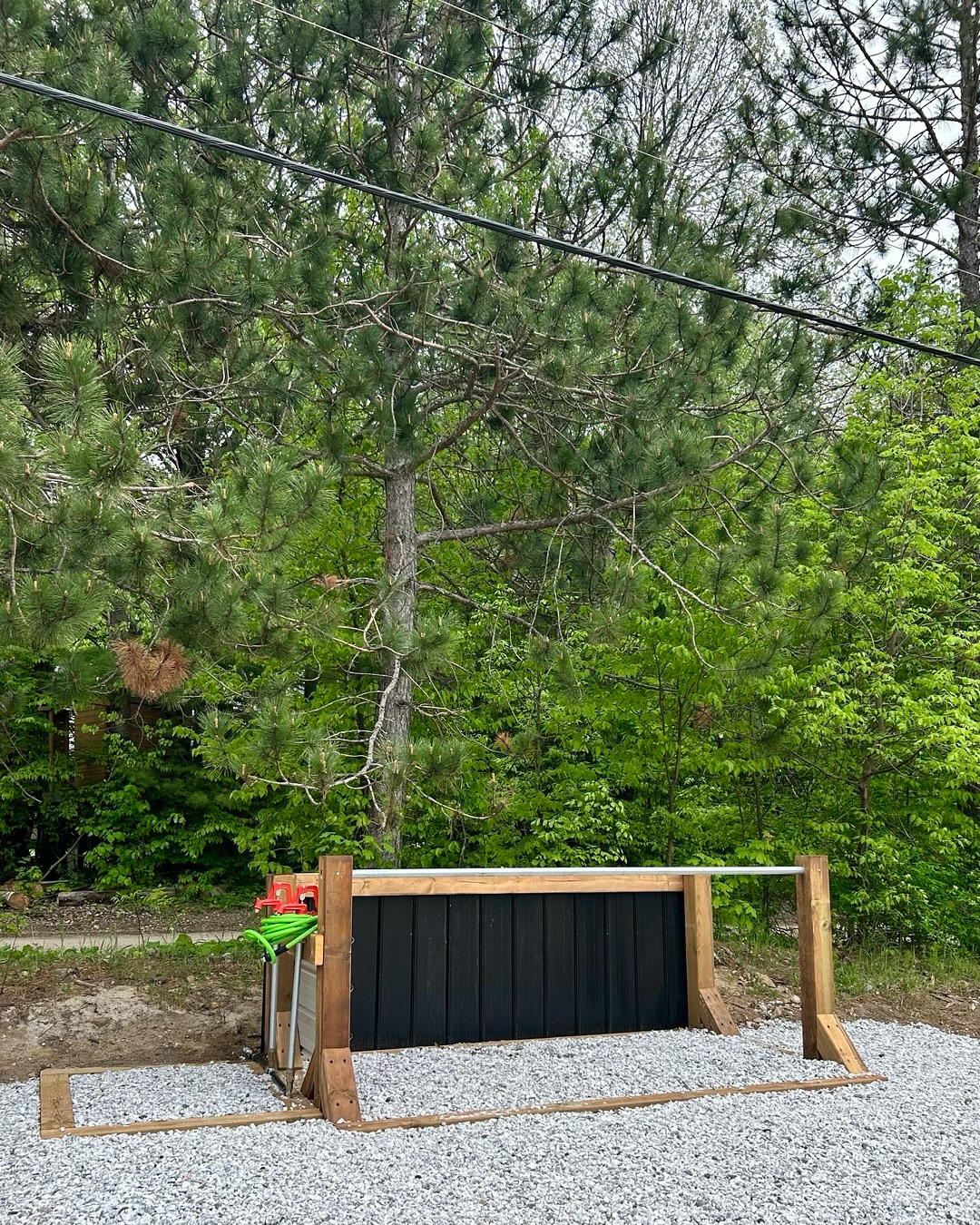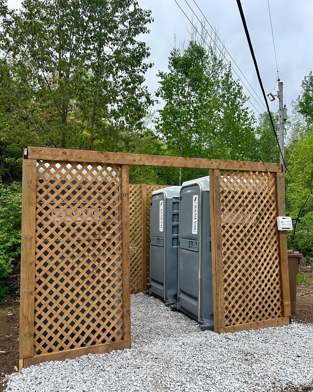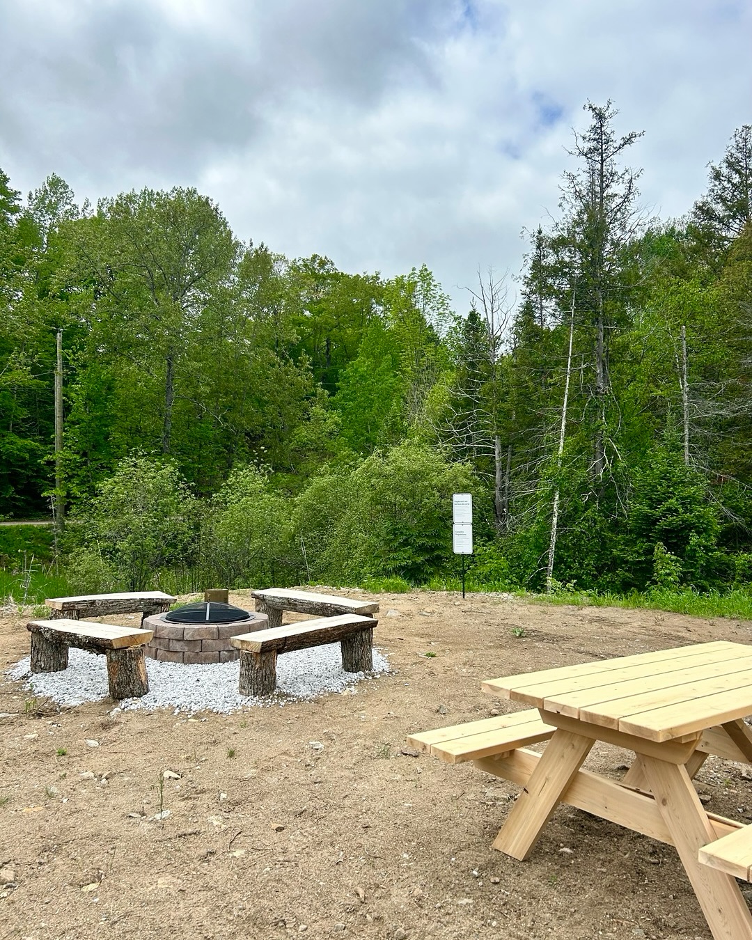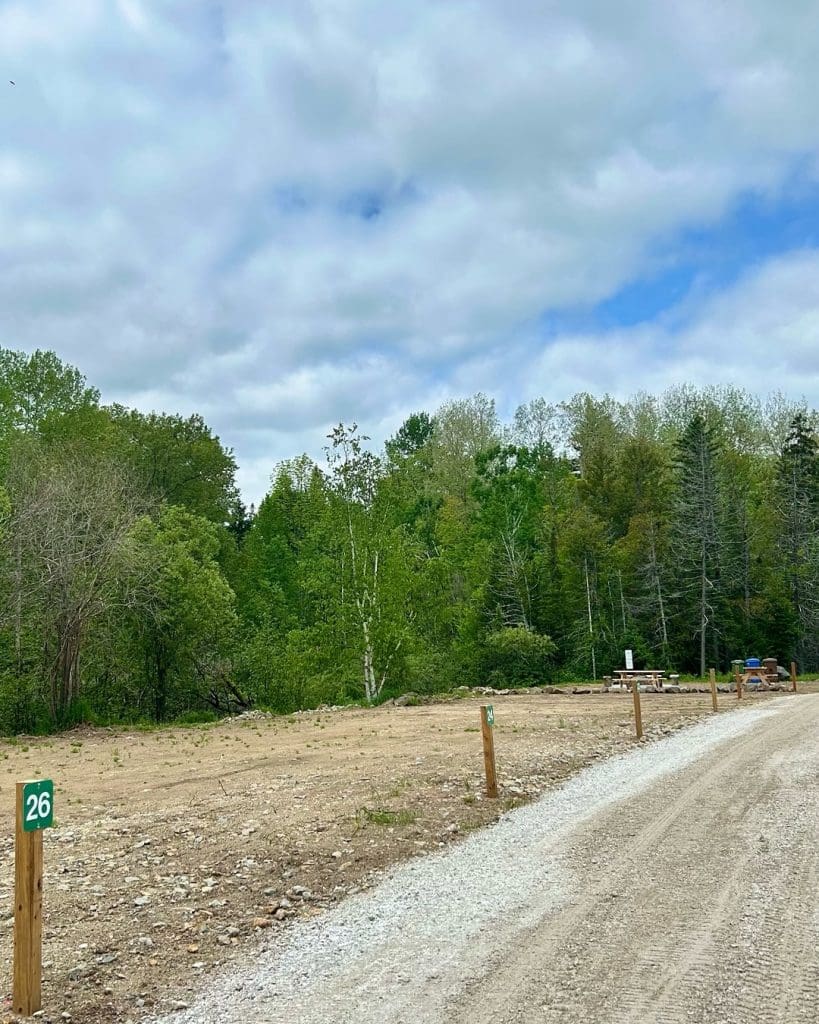 The campground includes two communal areas equipped with fire pits, picnic tables, portable toilets, a potable water point, and a bike‑washing station.