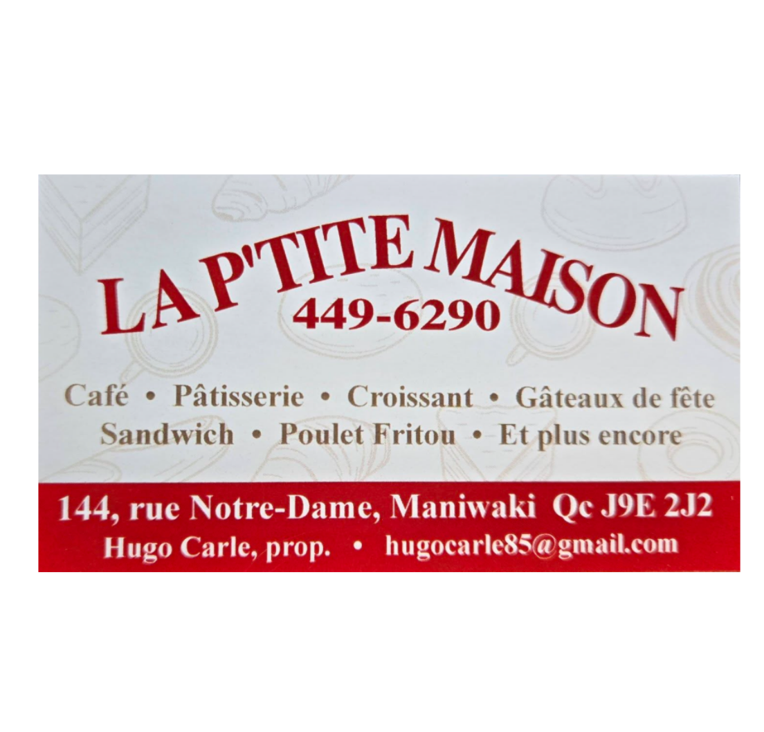 Located in the heart of Maniwaki, La P’tite Maison offers its signature Fritou” fried chicken, along with homestyle prepared meals, breads and pastries, and custom birthday cakes.
