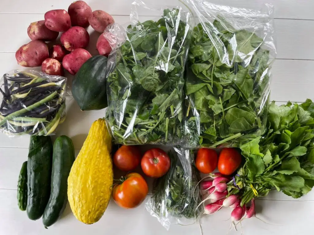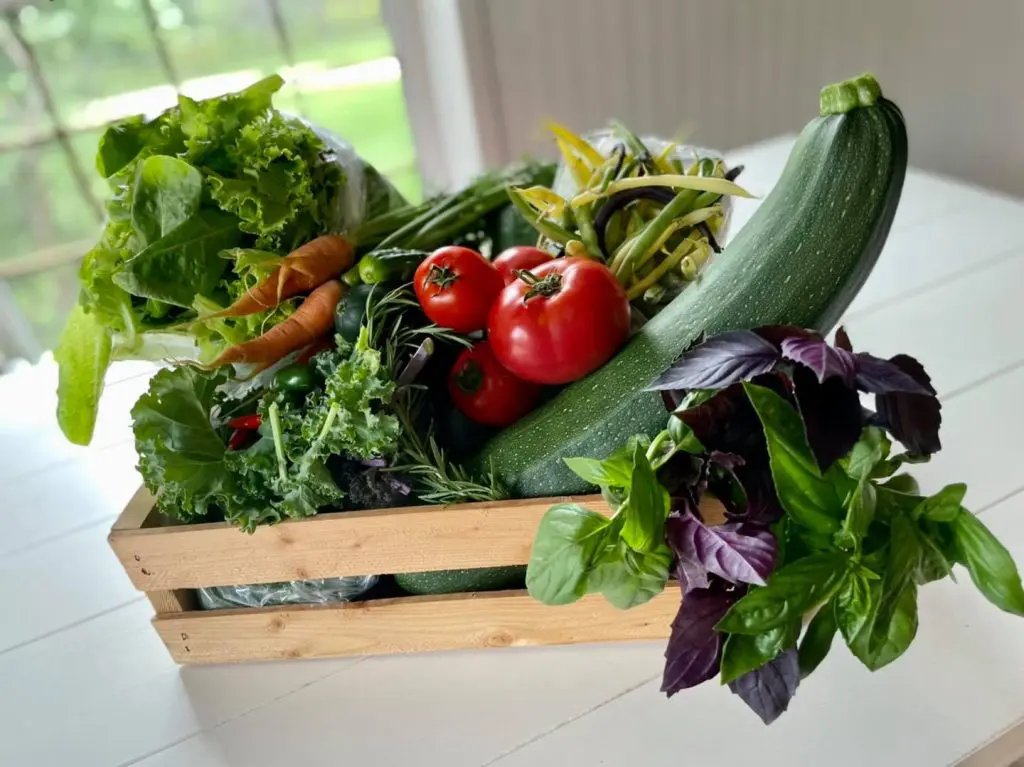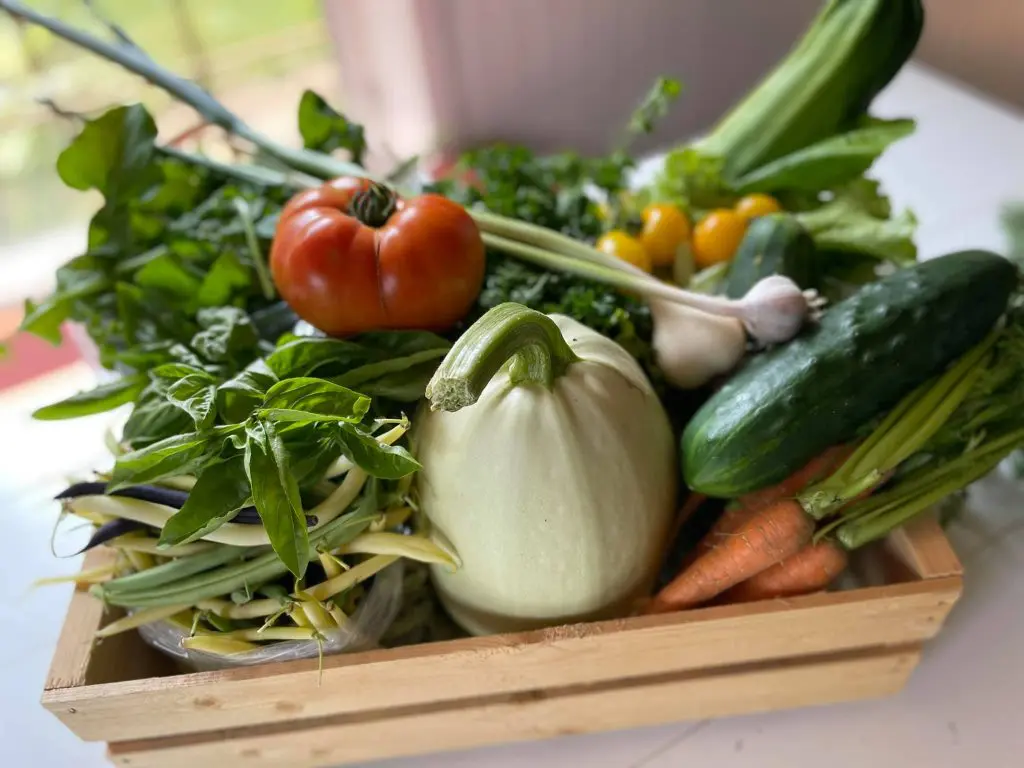 Plus de 30 variétés de légumes et fines herbes, notamment : bettes à carde, chou frisé, courge, mesclun, haricots, oignons, piments forts, pommes de terre, tomates et radis.