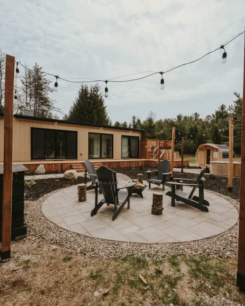 • Mini chalet moderne avec espace feu extérieur, sauna et bain chaud au Kaza Chalets & Spa à Kazabazua en Outaouais.