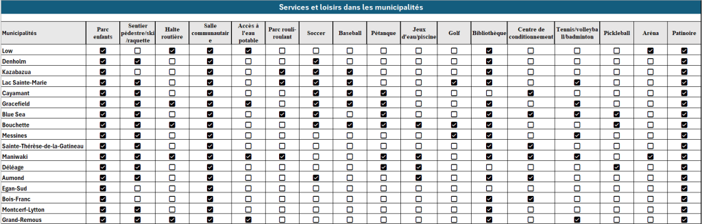 Voici les tableaux présentant un aperçu des services et activités offerts sur notre territoire, ainsi que les coordonnées de nos parcs.
