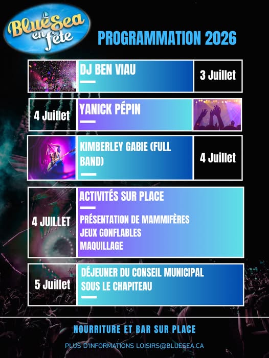 La municipalité de Blue Sea est heureuse de dévoiler la programmation de son festival «Blue Sea en fête 2026, qui se tiendra du 3 au 5 juillet prochains.
