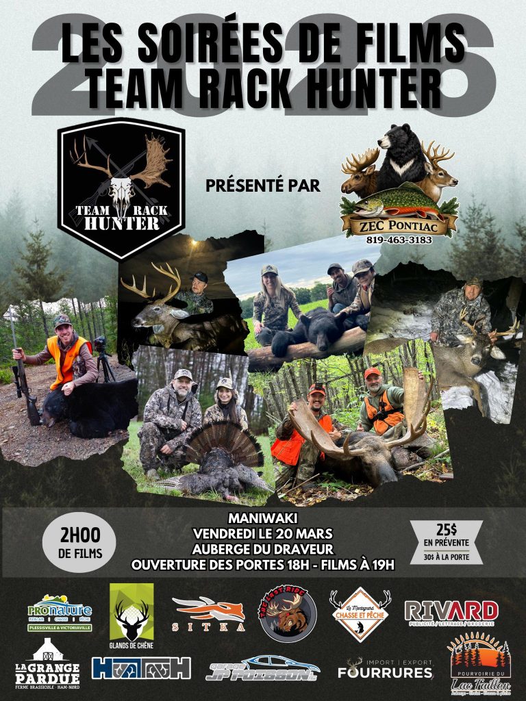 La ZEC Pontiac est heureuse de vous présenter Les Soirées de Films TEAM RACK HUNTER, qui auront lieu le 20 mars prochain à l’Auberge du Draveur. L’événement est organisé par deux passionnés : Sylvain Fournier et Éric Longpré.
