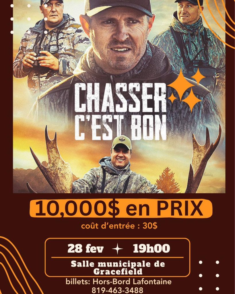 Hors-Bord Lafontaine et Born to Hunt sont heureux de vous vous présenter leur soirée cinéma sur le thème de la chasse, qui se tiendra le 28 février prochain, à la salle municipale de Gracefield.